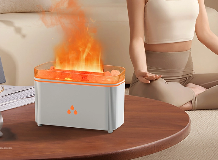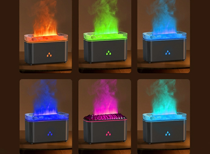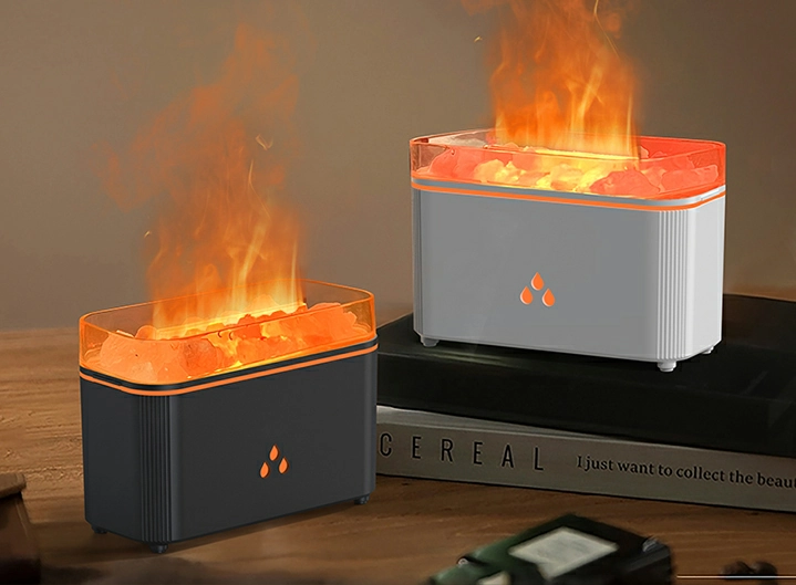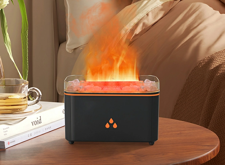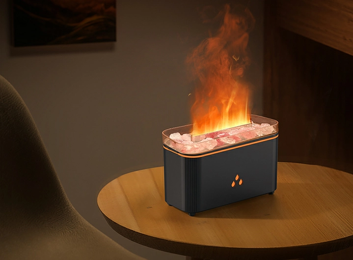 Inspired by the warmth of glowing embers, this humidifier features a charcoal-textured body with soft flame lighting, blending utility with cozy visual appeal — a calming presence on your desk or nightstand. |