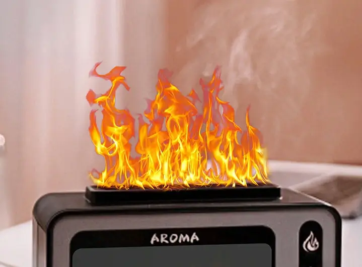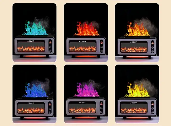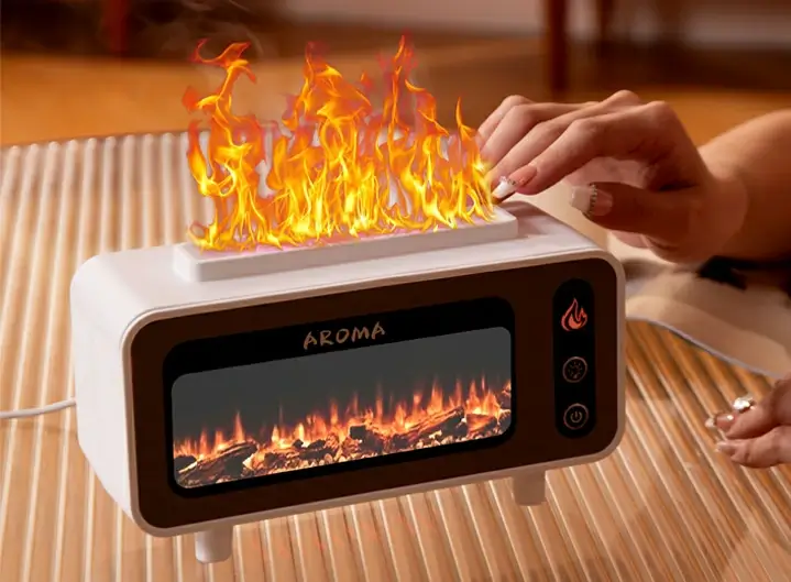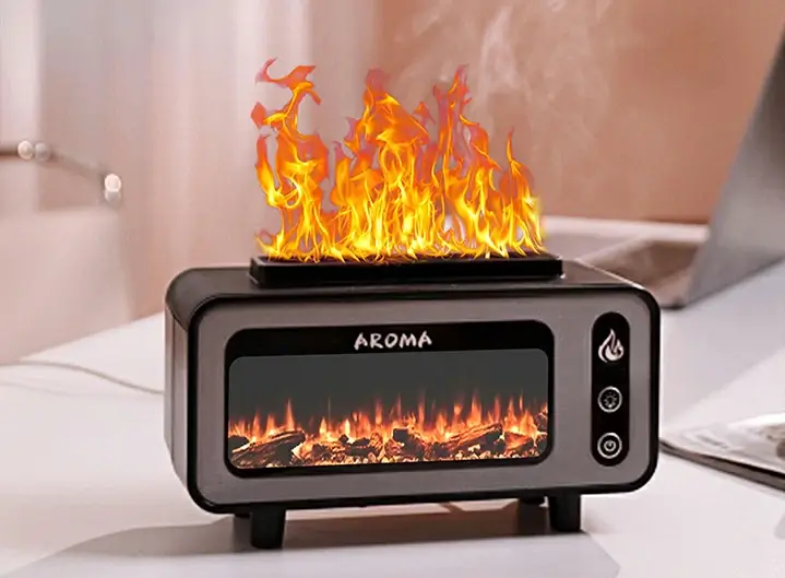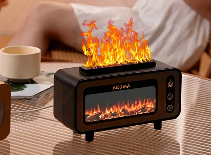 Inspired by the warmth of glowing embers, this humidifier features a charcoal-textured body with soft flame lighting, blending utility with cozy visual appeal — a calming presence on your desk or nightstand. |