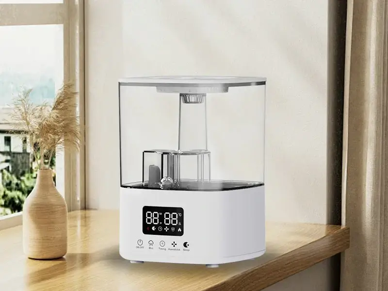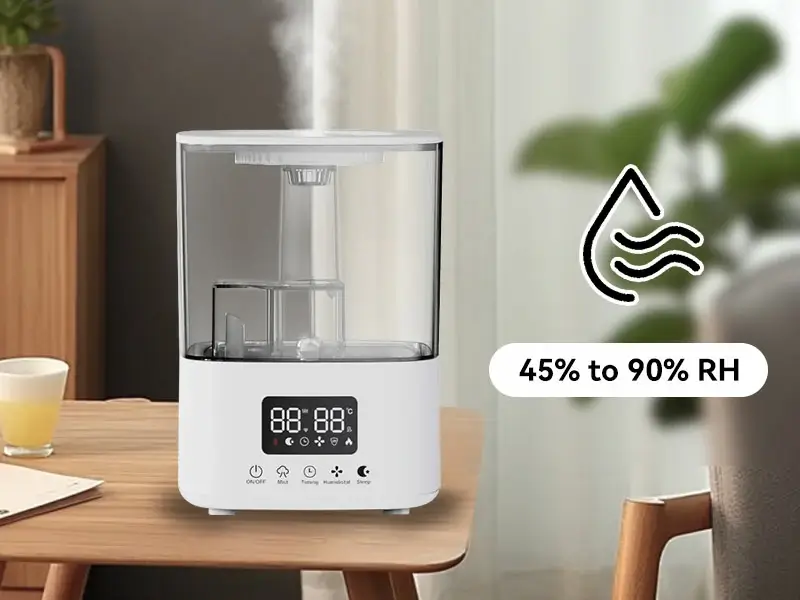 360° Mist Coverage The air humidifiers for bedroom features a 4-liter tank . 360° rotating nozzles disperse mist evenly, maintaining optimal humidity throughout the room. Humidity adjustment range: 45% to 90% RH, You can choose three different levels to cater to varying room humidity needs.