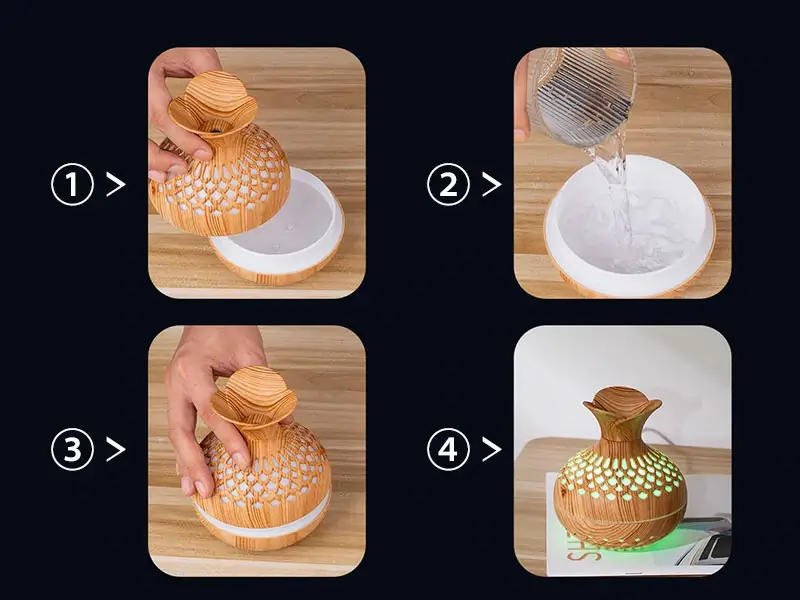 Mini Humidifier features a charming flower design with a stylish wood grain finish,this elegant addition enhances home or office decor, making it an ideal choice for those seeking a decorative yet functional small humidifier. |