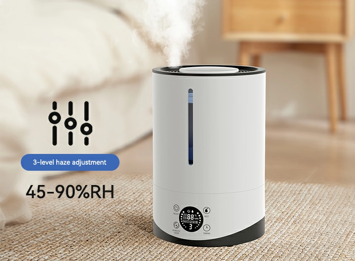 Smart humidifier’s sensor regulates for optimal humidity(45-90%RH), offering three settings to match your preferences. This feature caters to your specific humidity needs, whether you require a light mist humidifier for small room or a heavy mist humidifier for larger home. |